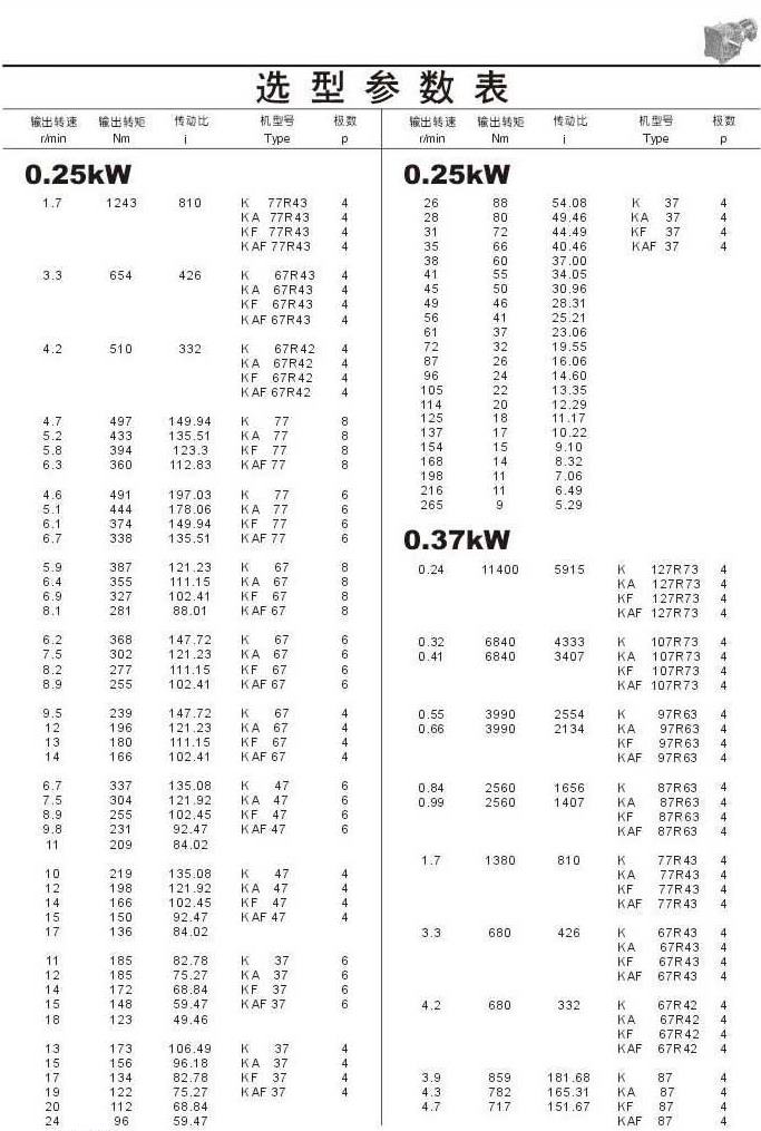 選型參數表0.25kW和0.37kW